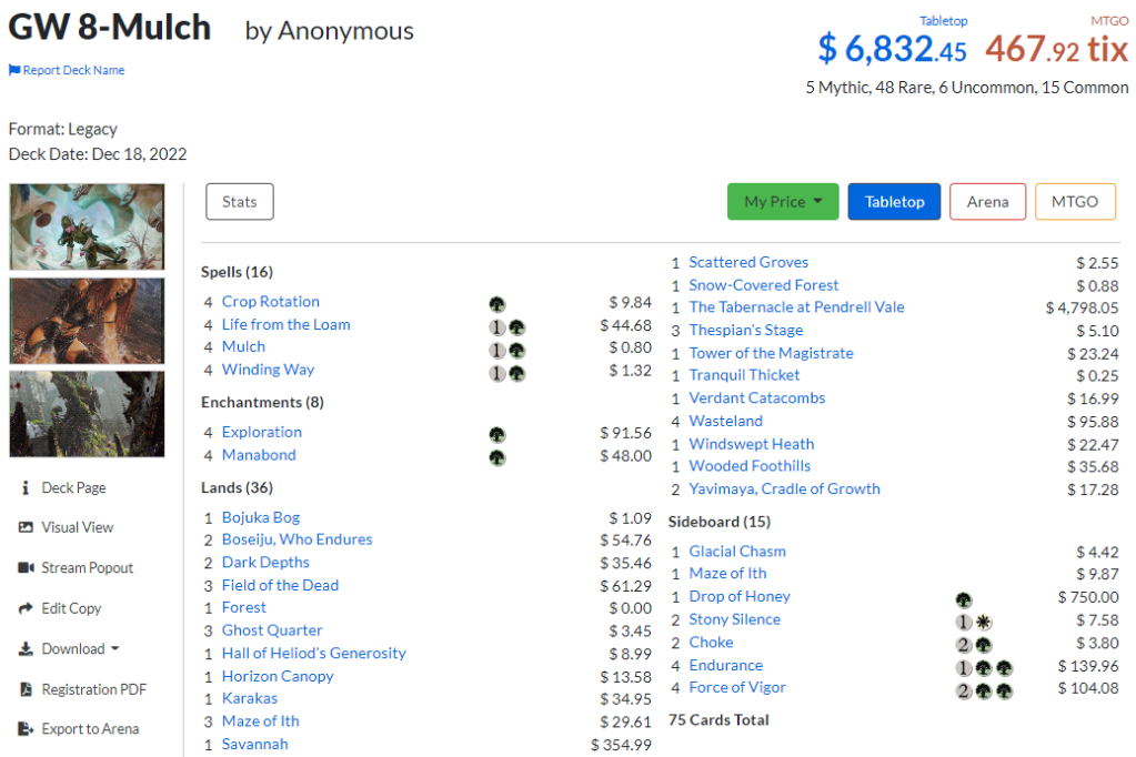 When I started looking for compromises to mitigate one of those problems, I basically found two options, like the rest of the community: play a multicolor Lands build to add necessary protection and interaction spells to go with the “big” spells/tools, or play the newfangled turbo Field of the Dead build with 8 copies of Mulch. Significantly, I don’t think anyone has cracked the code for a return to the Gamble builds of years past; that metagame space is probably the exclusive domain of Turbo Depths at this point. Unlike most of the community, I think that coming in from a couple years of life obligations crowding out my legacy-playing time helped me approach 8-Mulch with a little more of an open mind.