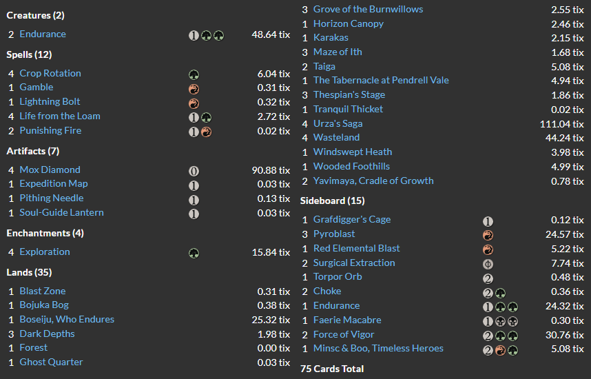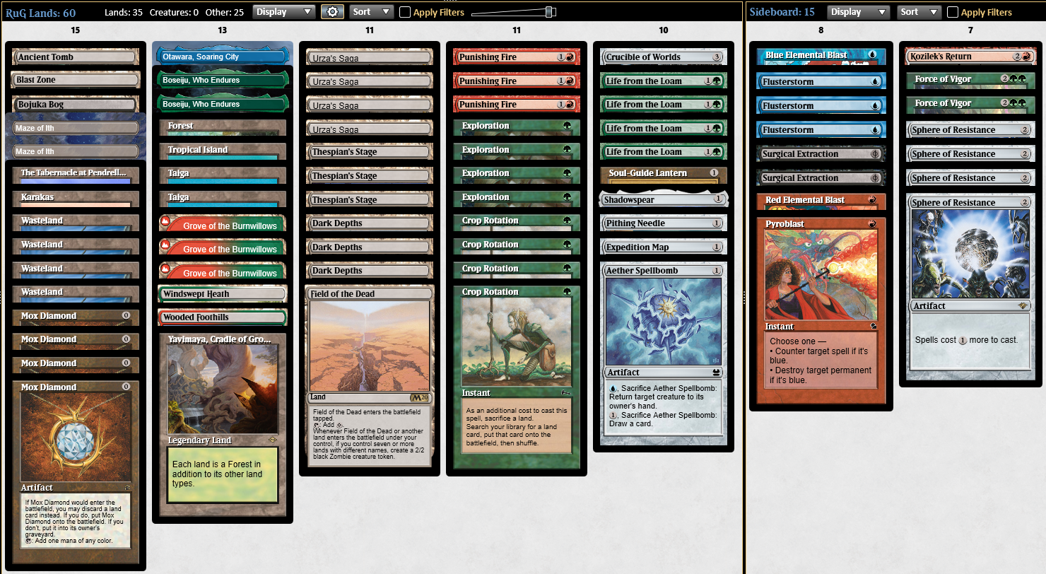 4 Exploration 4 Life from the Loam 4 Crop Rotation 4 Mox Diamond 3 Punishing Fire 2 Card advantage/ value engines At least 3 Saga targets 3 Dark Depths 3 Thespian’s Stage 4 Urza’s Saga 4 Wasteland 1 The Tabernacle of Pendrell Vale 2 Maze of Ith 1 Blast Zone 1 Bojuka Bog 1 Karakas 1 Boseiju, Who Endures 1 Forest 1 Yavimaya, Cradle of Growth 3 Grove of the Burnwillows At least 5 other green mana sources/fetchlands