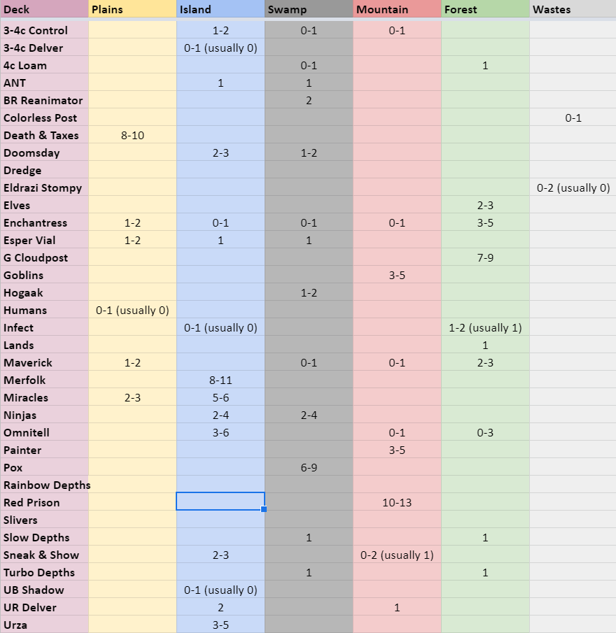 To know when trying to do this is correct, it is important to know how many basic lands your opponent is likely to be playing. To help with this, I’ve set up a list of common decks and the number of basic Lands they’re likely to be on. This list, of course, is merely a guideline; as the format changes or people try different builds, the numbers could well be off. Still, it should be of some use, and no set of Lands resources would be complete without this kind of information.
